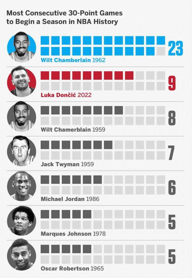 另外张伯伦还曾开季贯穿23场比赛砍下30+,最接近的东谈主是卢卡·东契奇,他贯穿作念到过9场。